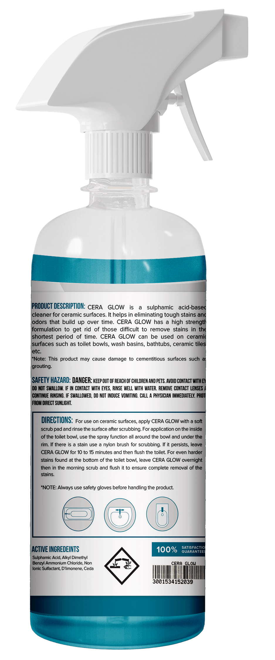 Experience the cleaning power of CERA Glow, a highly effective sulphamic acid-based cleaner designed for both toilet bowls and ceramic surfaces. Say goodbye to stubborn stains and unpleasant odours that accumulate over time. CERA boasts a potent, high-strength formulation that swiftly tackles even the most stubborn stains, delivering impressive results in no time.