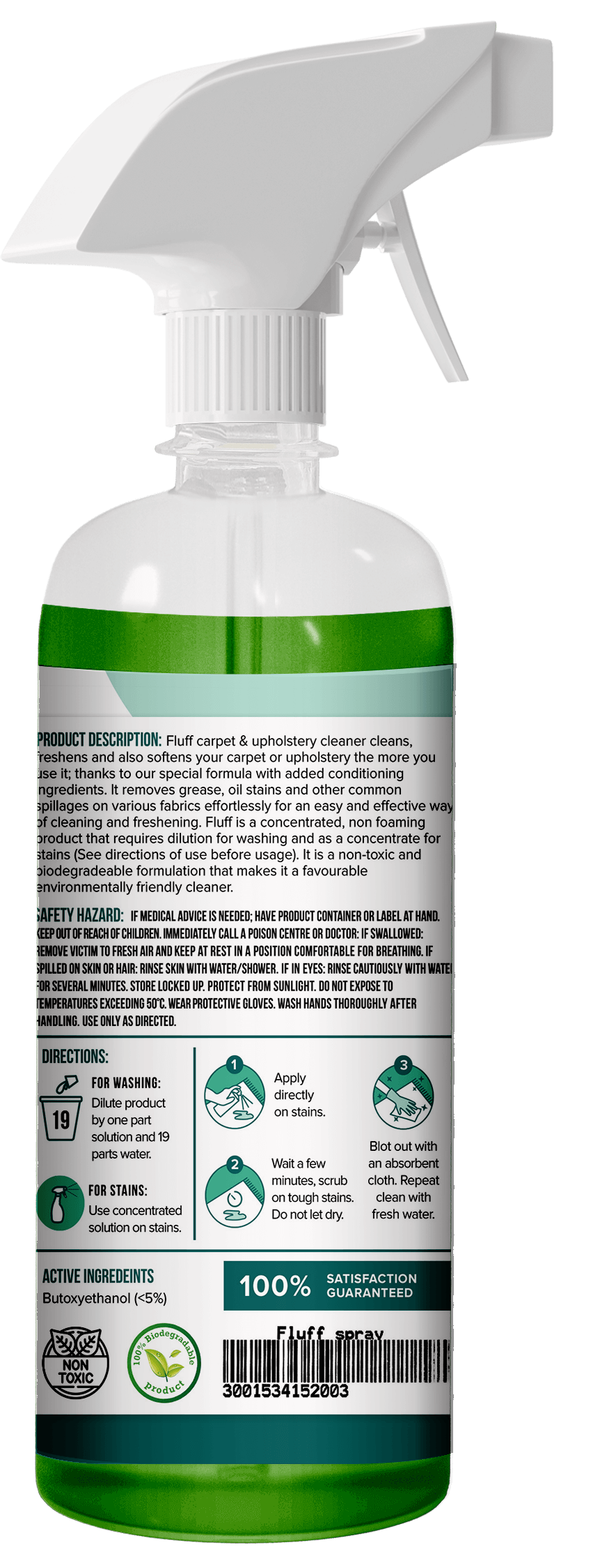 Fluff cleans, freshens and also softens your carpet or upholstery the more you use it; thanks to our special formula with added conditioning ingredients. It removes grease, oil stains and other common spillages on various fabrics effortlessly for an easy and effective way of cleaning and freshening. Fluff is a concentrated, non-foaming product that requires dilution before use (See directions of use before usage). It is a non-toxic and biodegradable formulation that makes it a favourable environmentally friendly cleaner.