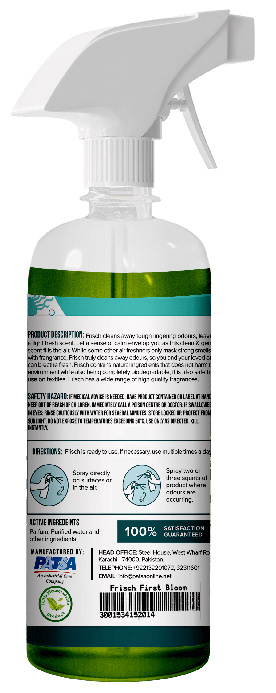 Frisch cleans away tough lingering odours, leaving a light fresh scent. Let a sense of calm envelop you as this clean & gentle scent fills the air. While some other air fresheners only mask strong smells with fragrance, Frisch truly cleans away odours, so you and your loved ones can breathe happily. While most other air fresheners contain dangerous gas, Frisch contains natural ingredients that do not harm the environment while also being completely biodegradable, it is also safe to use on textiles. Frisch has a wide range of high-quality fragrances.