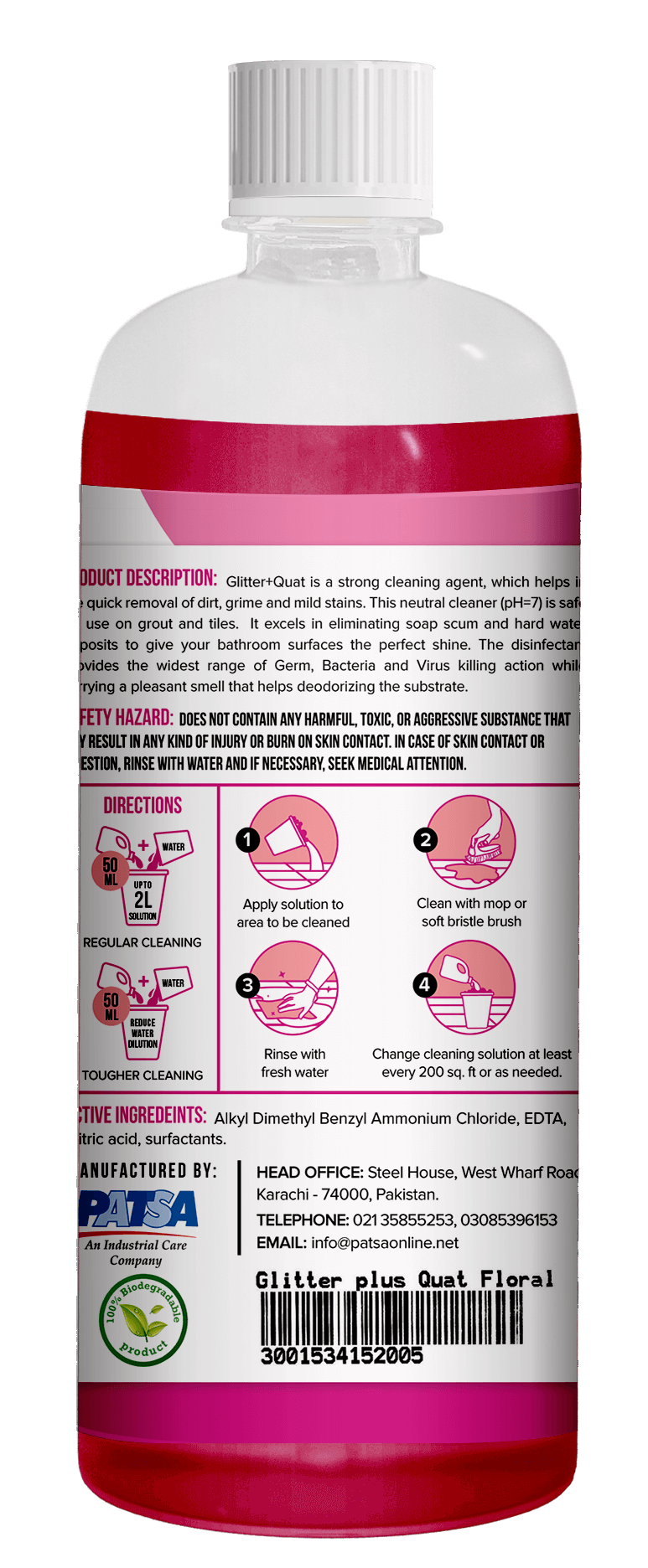 Discover the cleaning power of Glitter + Quat, a robust cleaning agent designed to swiftly tackle dirt, grime, and mild stains. This neutral cleaner with a pH of 7 is safe for use on tile grouts, ensuring a sparkling tile surface while effectively eliminating soap scum and hard water deposits. What sets it apart is its disinfectant properties, providing comprehensive germ, bacteria, and virus elimination. Plus, its pleasant scent serves as a deodorizer, leaving your surfaces smelling fresh and clean.