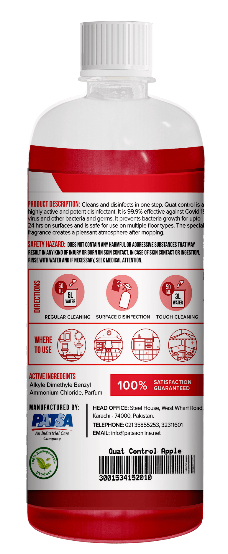Quat Control is a highly active and potent germ, virus and bacteria killer. It is water soluble and even effective in hard water. Quat Control is potent as a broad-spectrum disinfectant, fungicide, deodorizer, hard surface cleaner and non-food contact sanitiser. Available in multiple fragrances which create a pleasant environment after mopping.