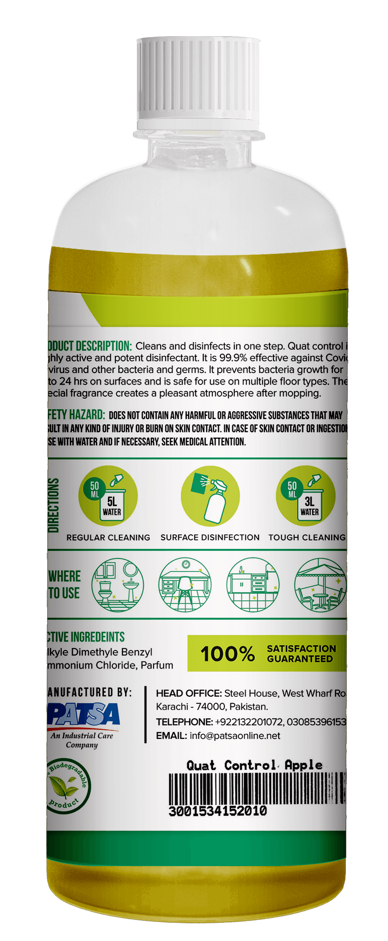 Quat Control is a highly active and potent germ, virus and bacteria killer. It is water soluble and even effective in hard water. Quat Control is potent as a broad-spectrum disinfectant, fungicide, deodorizer, hard surface cleaner and non-food contact sanitiser. Available in multiple fragrances which create a pleasant environment after mopping.
